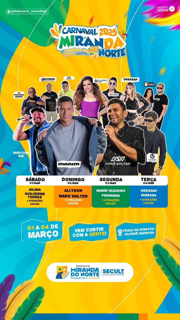 A folia vai tomar conta de Miranda do Norte entre os dias 1º e 4 de março, com uma programação recheada de atrações nacionais e regionais. O Carnaval 2025 promete ser um dos maiores já realizados na cidade, reunindo 20 atrações ao longo dos quatro dias de festa na Praça de Eventos Hildenê Barbosa.