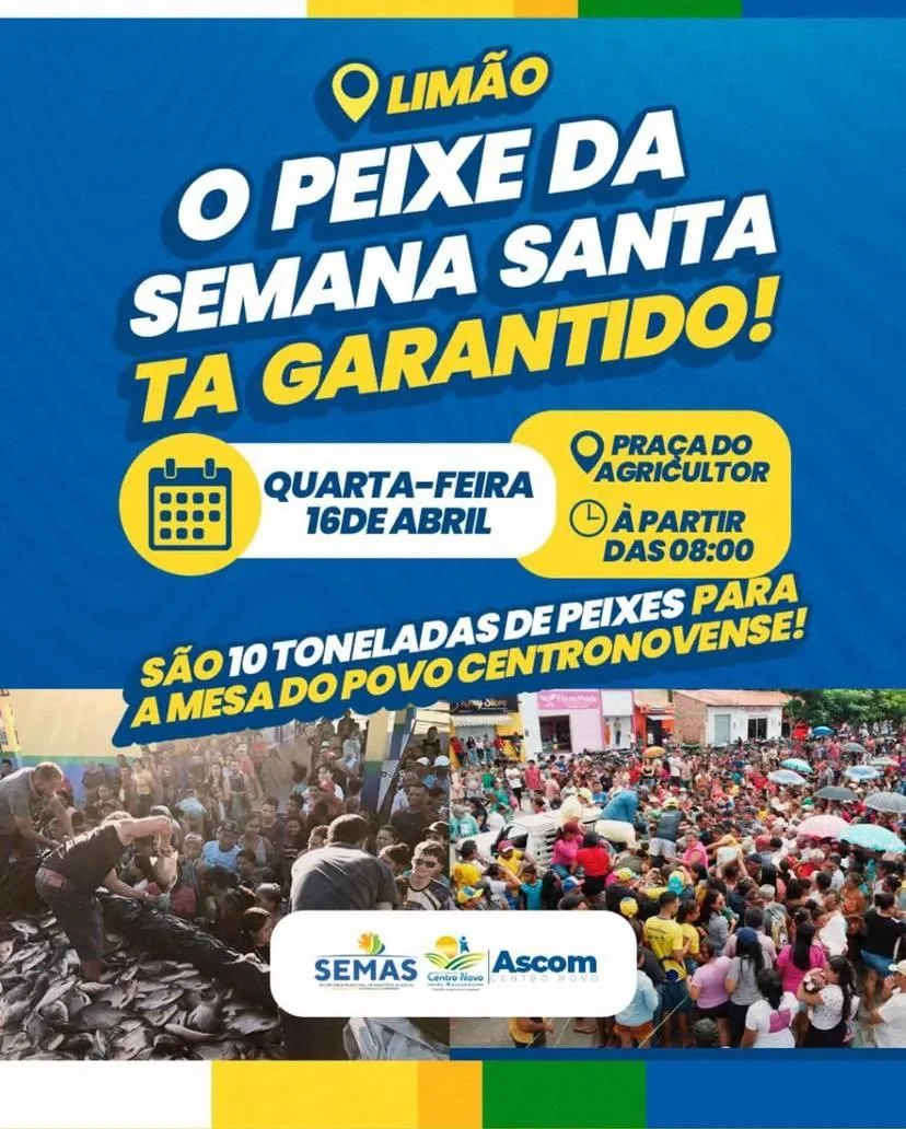 A Prefeitura de Centro Novo do Maranhão, por meio da Secretaria Municipal de Assistência Social (SEMAS), realizará nesta quarta-feira, 16 de abril, a distribuição de peixes no povoado Limão, como parte da programação da Semana Santa.
