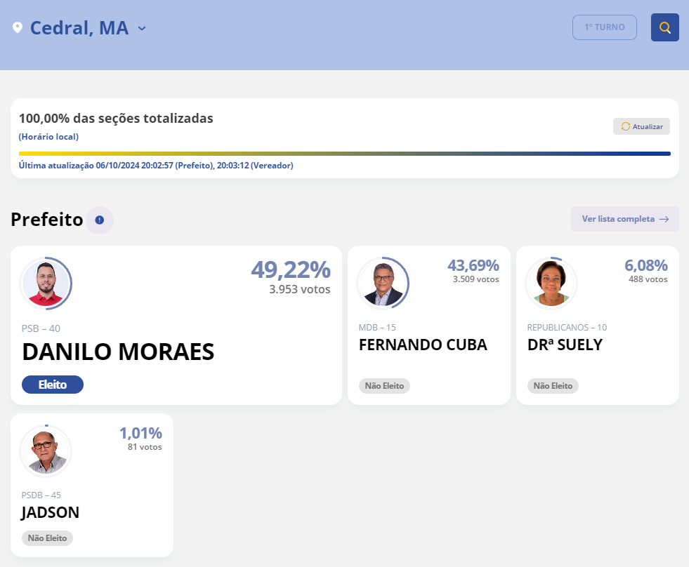 Danilo Moraes, do PSB, foi eleito prefeito de Cedral em uma disputa extremamente acirrada, conquistando 49,22% dos votos. O resultado confirmou a preferência da maioria da população, que viu em Danilo a oportunidade de renovar a liderança da cidade. Com 3.953 votos, ele superou seu principal concorrente, Fernando Cuba, que obteve 43,69% dos votos.