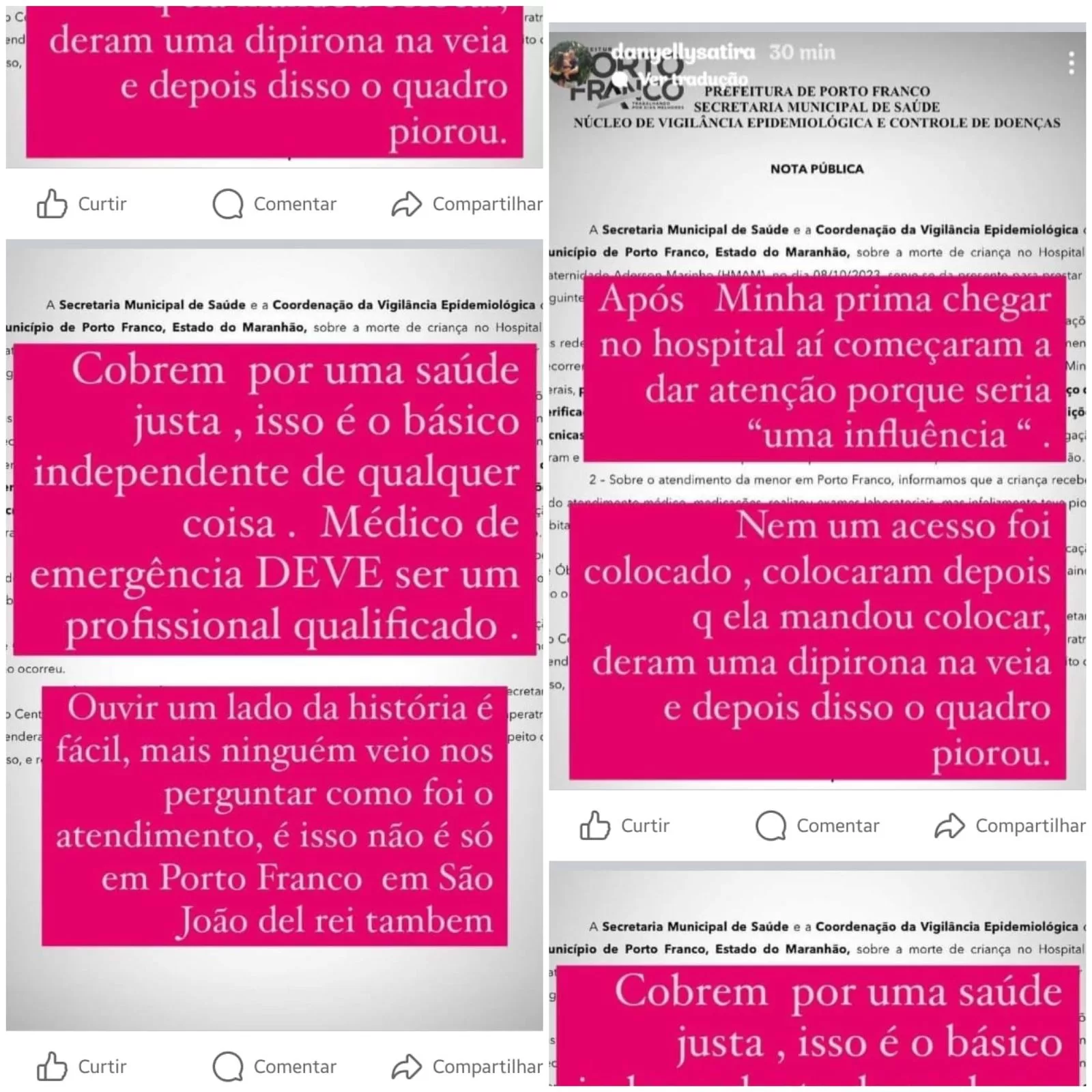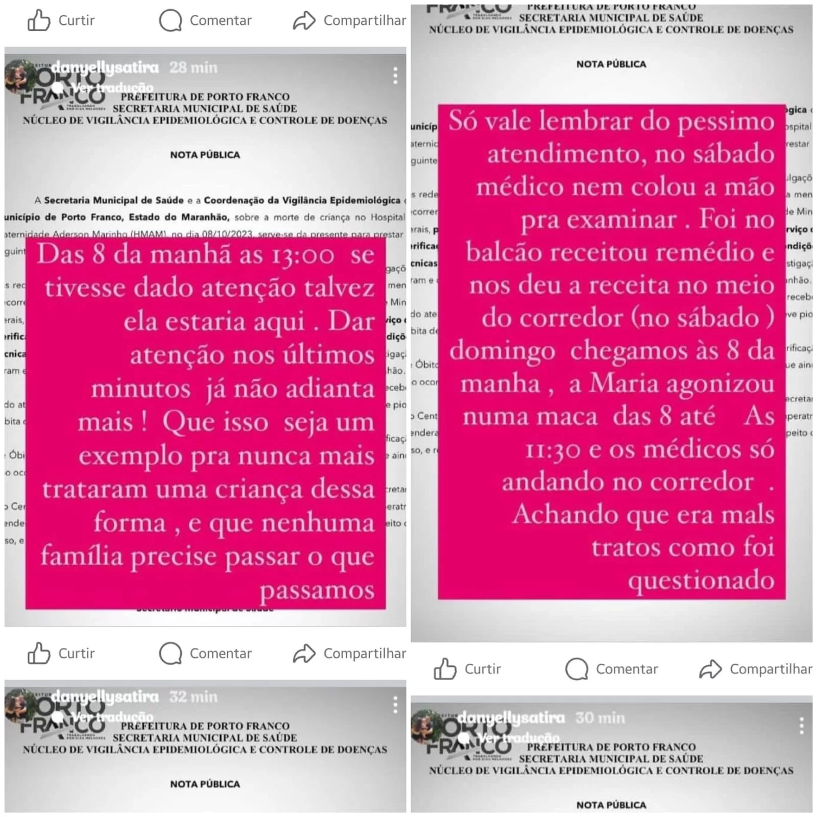 Após o caso suspeito em Porto Franco, envolvendo a morte de uma criança que veio da cidade de São João Del Rei em Minas Gerais, onde outras três crianças morreram, suspeitas da contaminação. Uma nota foi divulgada pela gestão de Deoclides Macedo (PDT), afirmando que a criança recebeu todo atendimento necessário no Hospital do município.