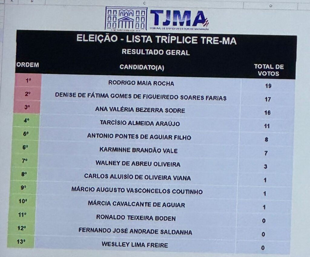 Cada desembargador escolheu três nomes, na ordem dos mais antigos para os mais recentes na Corte. Como o advogado Rodrigo Maia e as advogadas Denise Farias e Ana Valéria Sodré receberam mais do que o mínimo de votos exigidos, não houve necessidade de uma nova eleição.